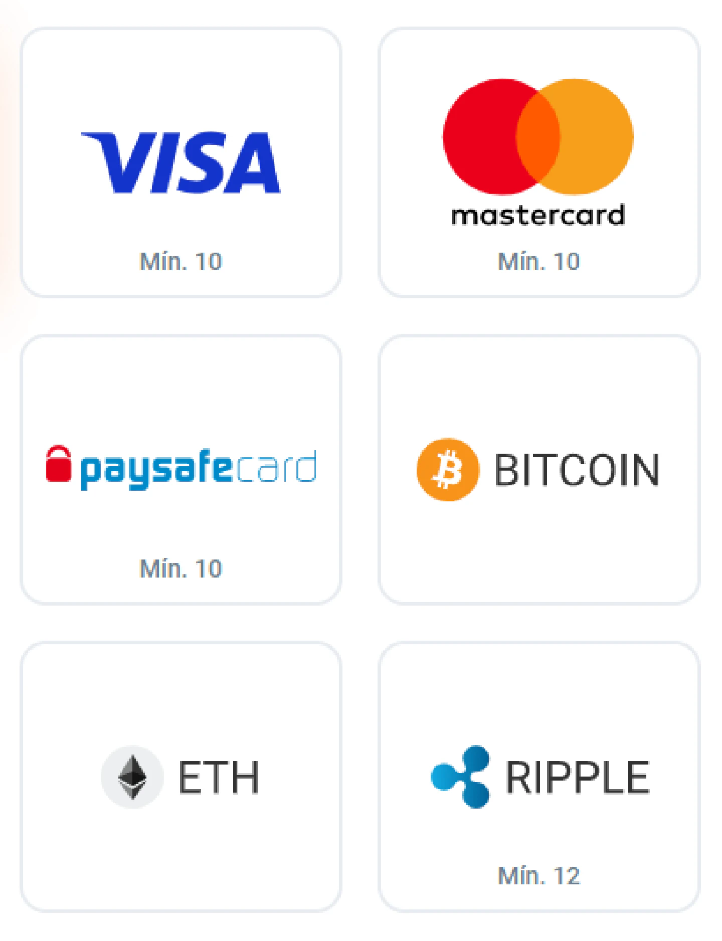 Aqui tens um resumo dos detalhes mais importantes relacionados com os depósitos, incluindo os montantes mínimos, os tempos de aprovação e os impostos para cada alternativa de pagamento disponível: