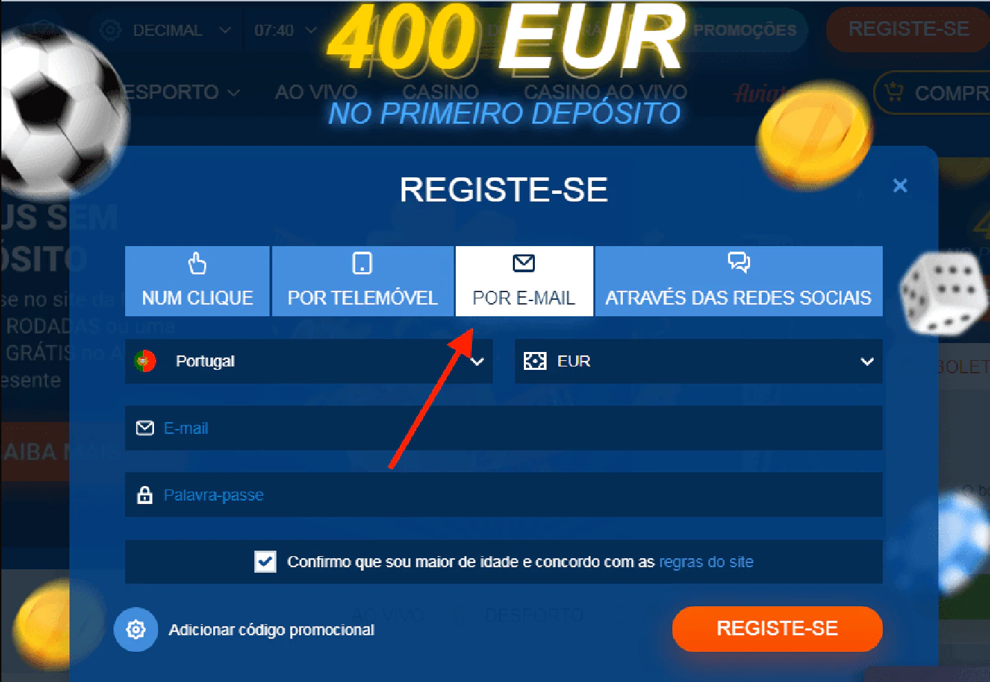 - Se tiveres um código promocional, é o momento de o utilizares. Confirma que tens mais de 18 anos e aceita as regras do site.